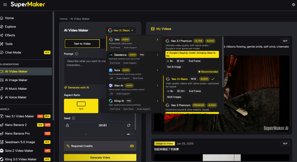 SuperMaker’s video ecosystem includes access to multiple major model families such as Sora, Veo, Kling, Wan, and Seedance, rather than locking users into a single generation engine. On its pricing page, SuperMaker lists models including Veo 3.1 Premium and Sora 2 Pro in paid plans. That multi-model setup gives creators more flexibility when they need different looks, styles, or strengths for different projects.